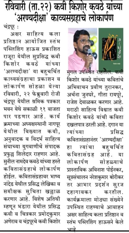 चंद्रपूर :अक्षर साहित्य कला प्रतिष्ठान आयोजित स्तंभ पब्लिशिंग हाऊस प्रकाशित राजूरा येथील सुप्रसिद्ध कवी किशोर कवठे यांच्या 'अरण्यदीक्षा' या बहुचर्चित काव्यसंग्रहाचा प्रकाशन व लोकार्पण सोहळा येत्या रविवारी, २२ फेब्रुवारी रोजी चंद्रपूर येथील श्रमिक पत्रकार भवन येथे सकाळी ११ वाजता पार पडणार आहे. कार्य क्रमाच्या अध्यक्षस्थानी नागपूर येथील विख्यात कवी,अनुवादक व...